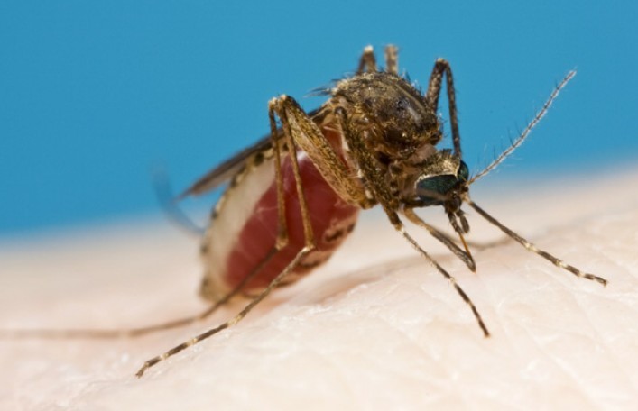 Female Culex mosquito taking a blood meal from a person.